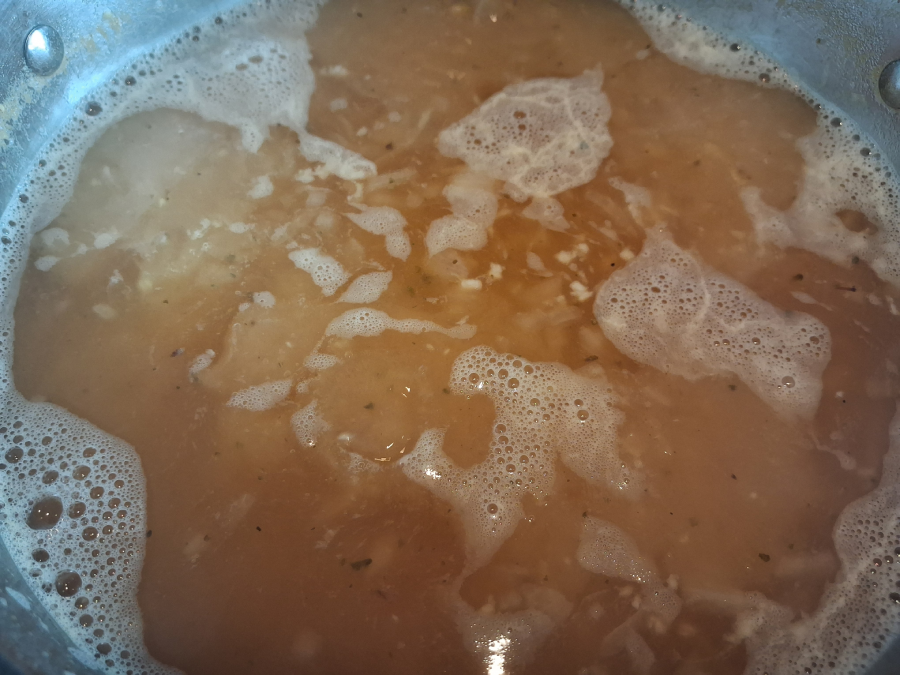 Tento cibuľovo-cesnakový základ pridáme do hrnca k hrachu, ktorý sa už varí, a dobre premiešame.